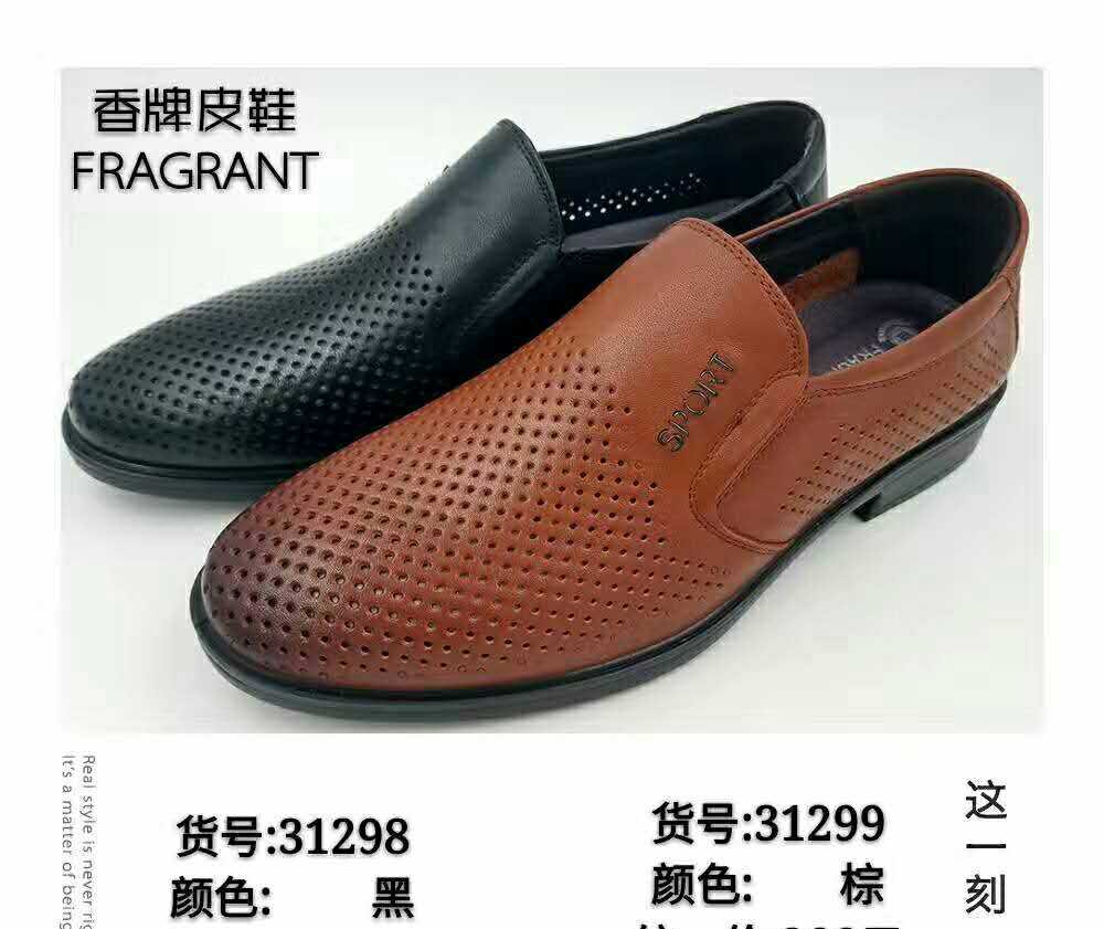 详情:货号: 31298品牌: 香牌鞋头款式: 圆头闭合方式: 套脚鞋面材质: 头层牛皮(除牛反绒)鞋面内里材质: 头层猪皮场合: 日常季节: 夏季颜色分类: 棕色 黑色尺码: 39 40 41 42 43 44款式: 休闲皮鞋功能: 透气